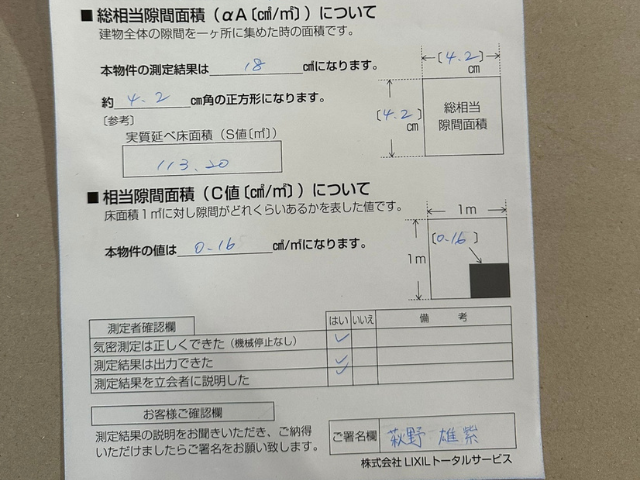 ちなみに、見学会の時点で気密測定も終えており、結果はC値0.16でした!