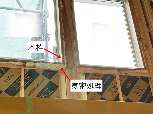 答えは「気密かな~」とのことで、具体的には窓回りの木枠の施工後にもしっかり気密処理してるんだよ、と教えてくれました。