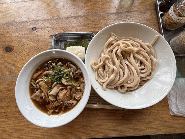 キノコつけ汁を頼みました。麺は太くてこしがあり、つけ汁も美味しかったです。