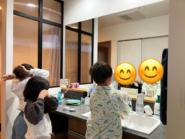 ①「洗面所に大きな鏡をつけて、大正解!と思った時があったので写真撮っておきました笑。やはり小学生にもなるの朝の鏡に向かう時間が長くなってきますが、その横でチャチャッと男子が洗顔を済ませることができて、とても使い勝手が良いです」